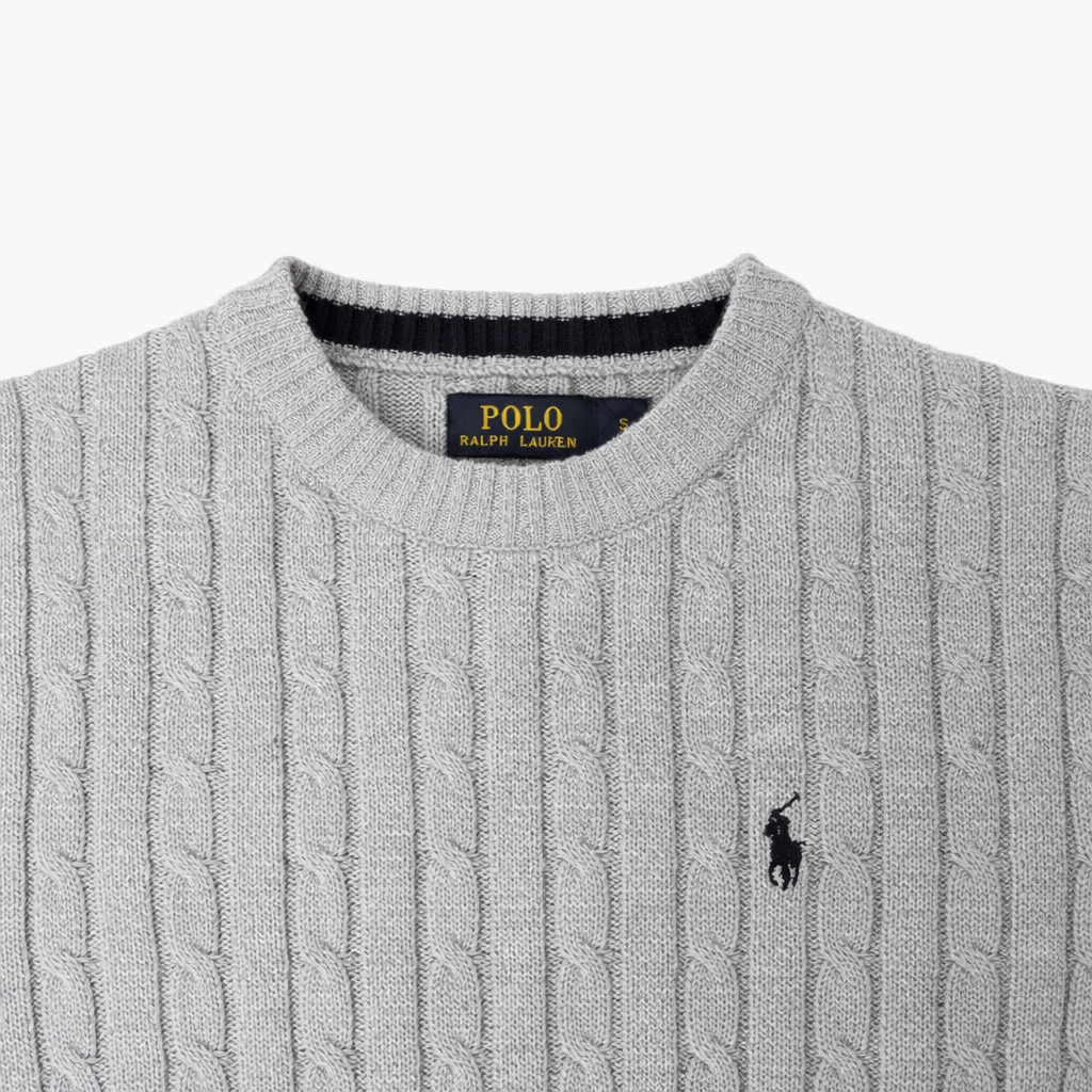RL IMPORTED SMALL PONY ROUND NECK CABLE KNIT SWEATER (HEATHER GREY)